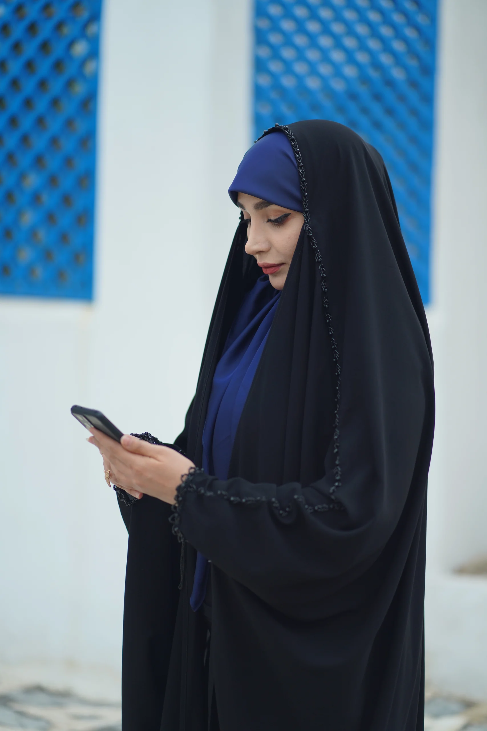 استفاده از سنگهای ریز و براق در امتداد لبه چادر، نوری خاص به چهره میدهد و هنگام حرکت، جلوهای بینظیر خلق میکند.