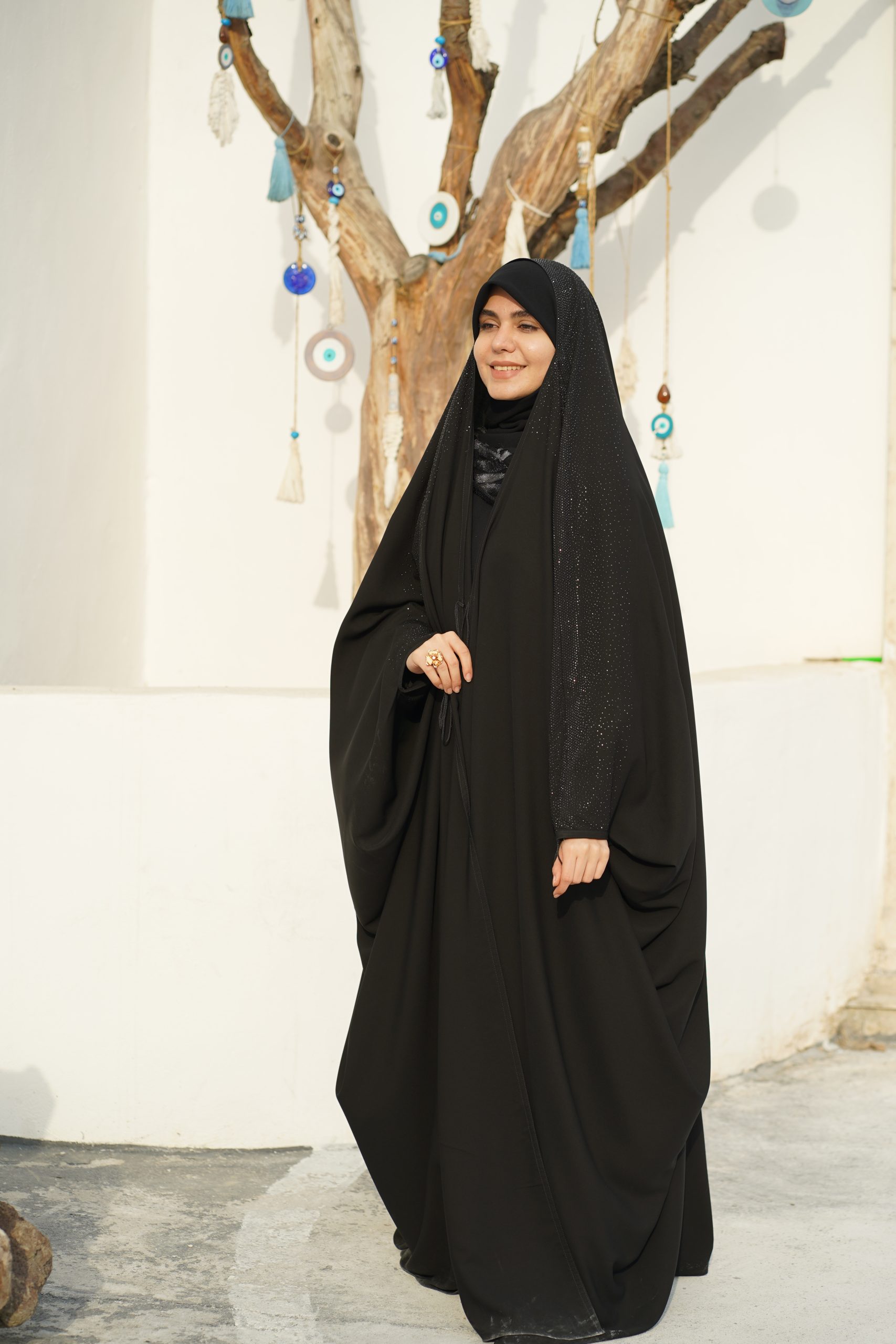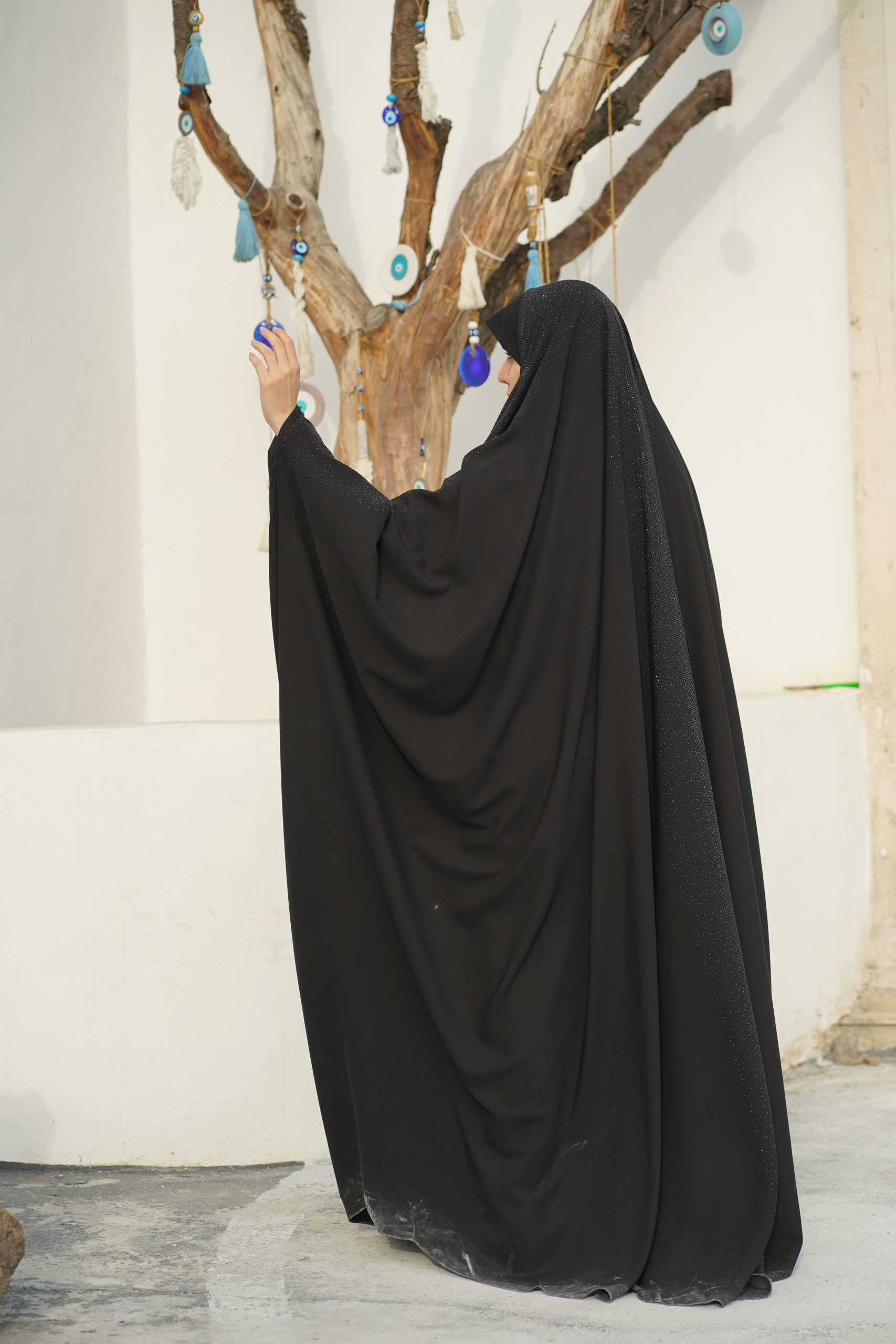 فروشگاه حجاب جلابیب است که با نگین‌کاری چشم‌نواز و ظریف از روی سر تا روی آستین‌ها و تا پایین پشت چادر تزئین شده است.